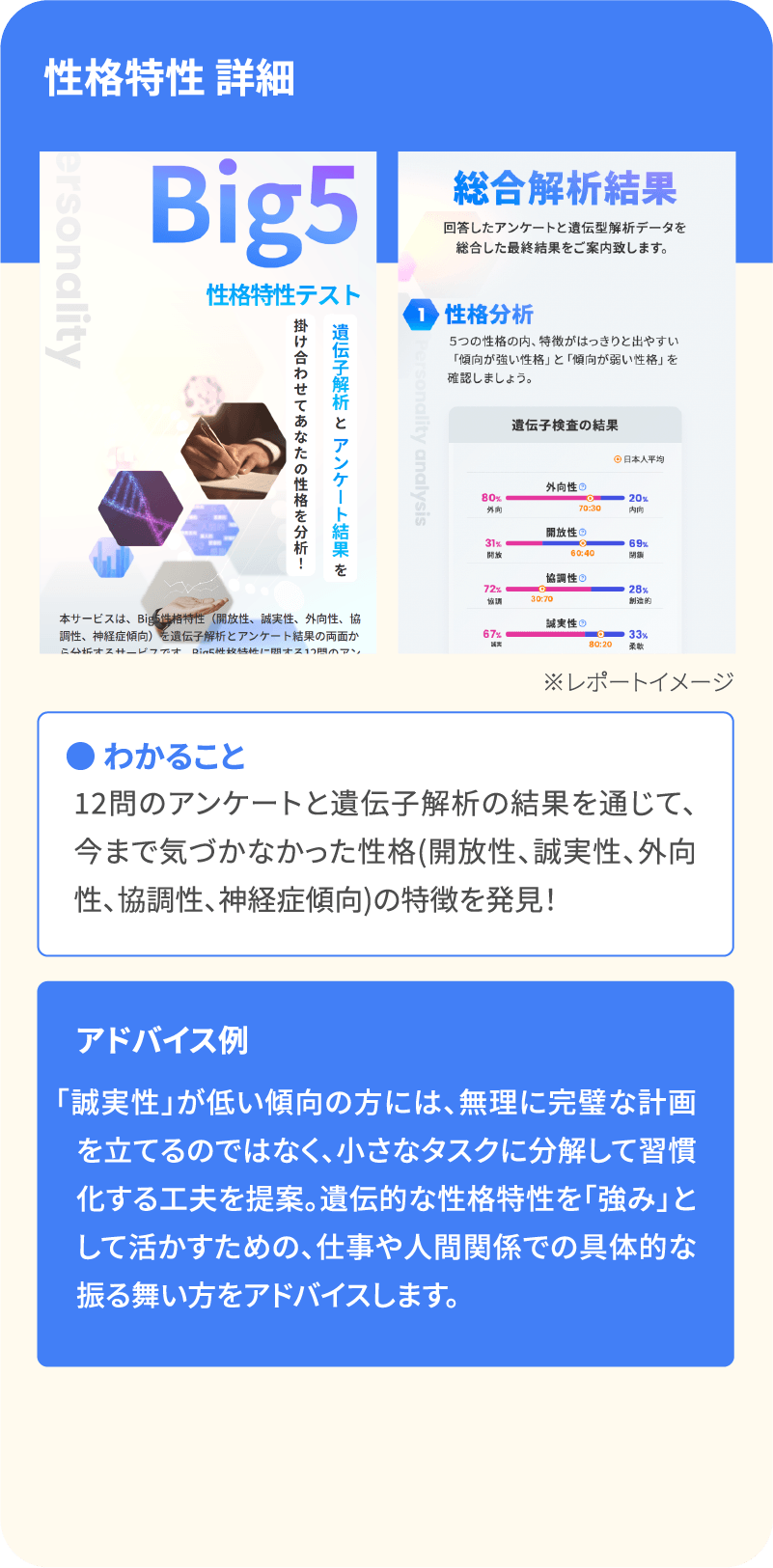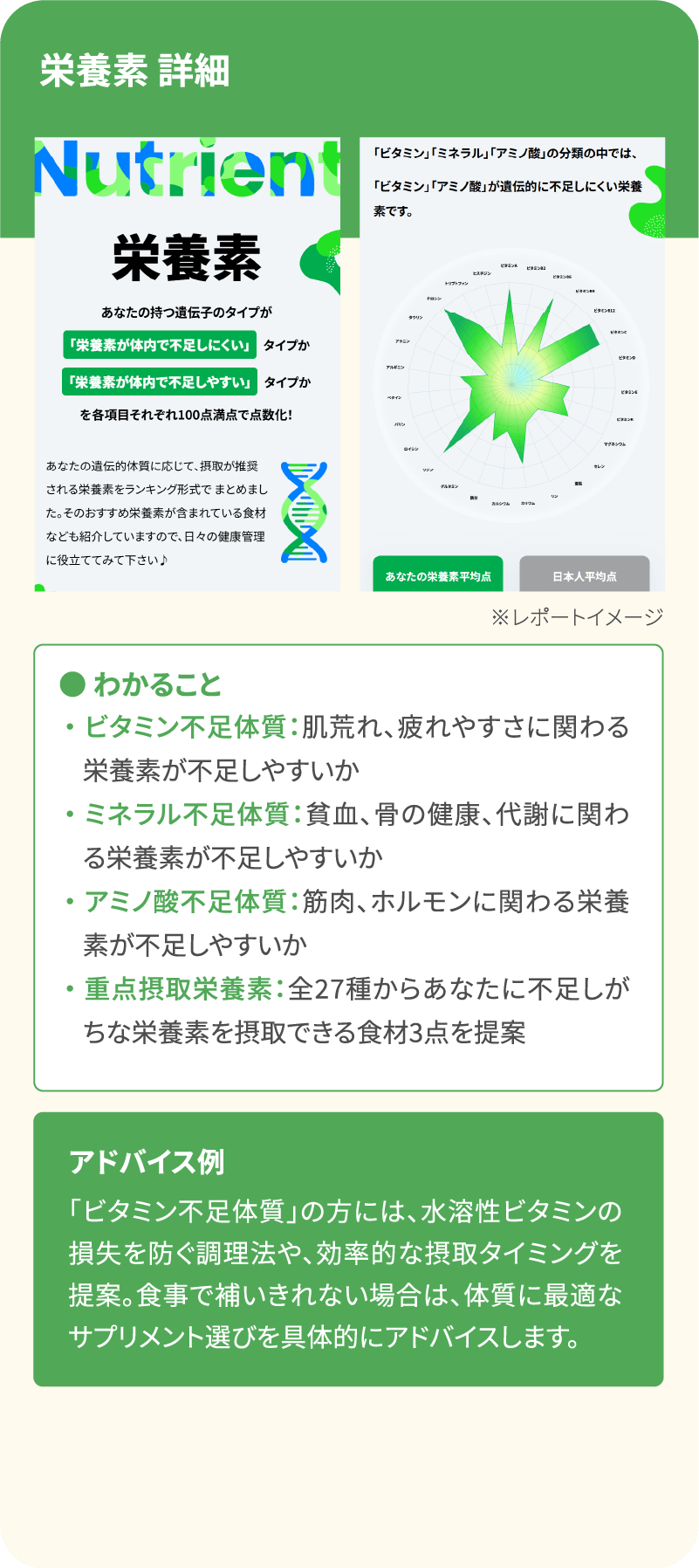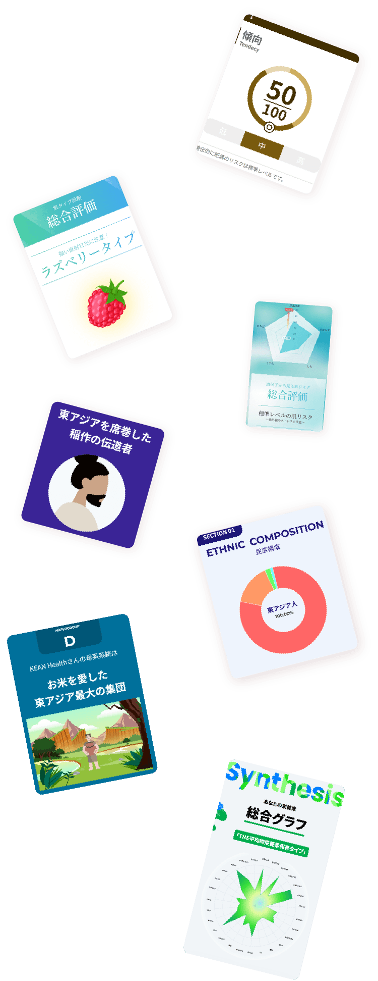 ダイエットや肌質、性格特性など、日常からビジネスまで役立つ遺伝的傾向がまるごとわかる、あなただけの「マイページ」をご用意します。