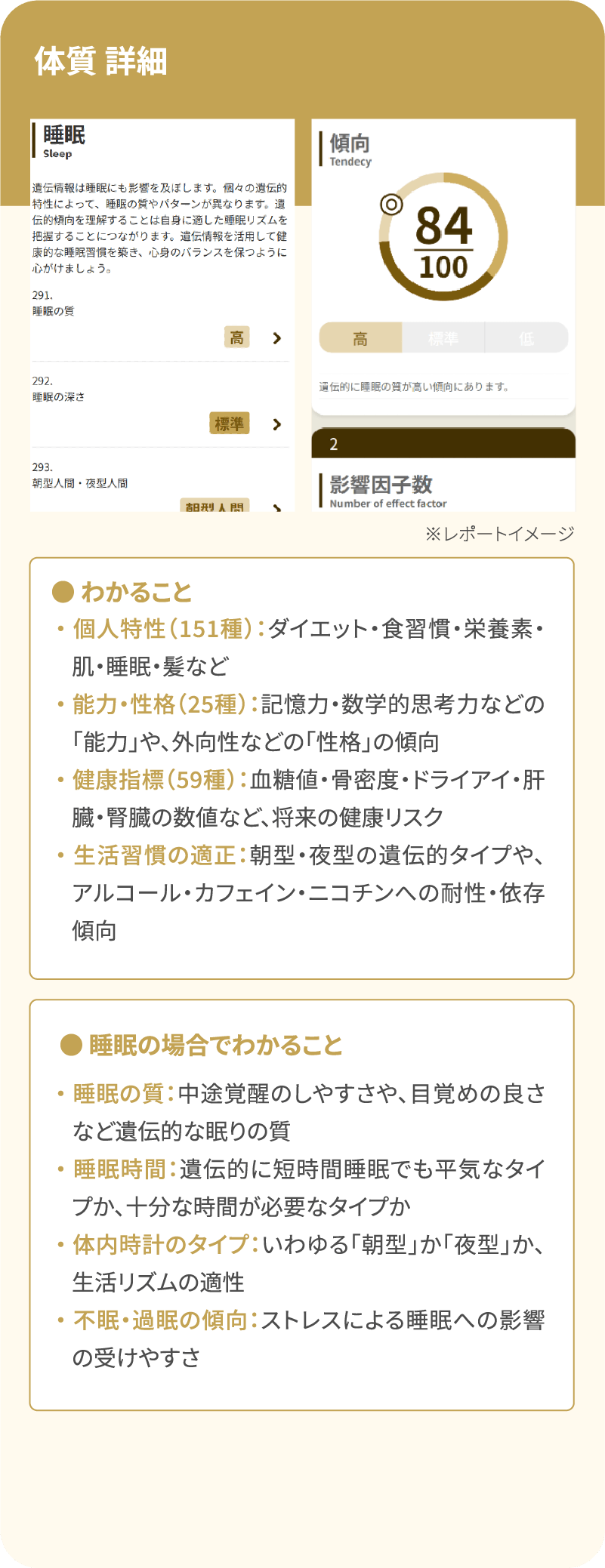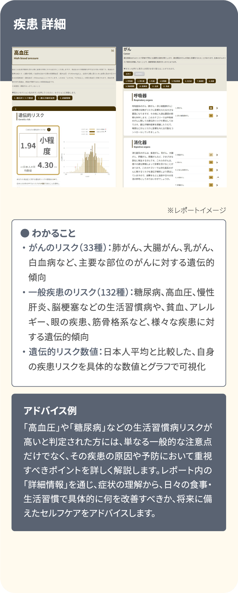 - 遺伝的な体質の傾向や病気のリスクを算出しています。検査時の健康や疾患の状態を診断するものではありません。