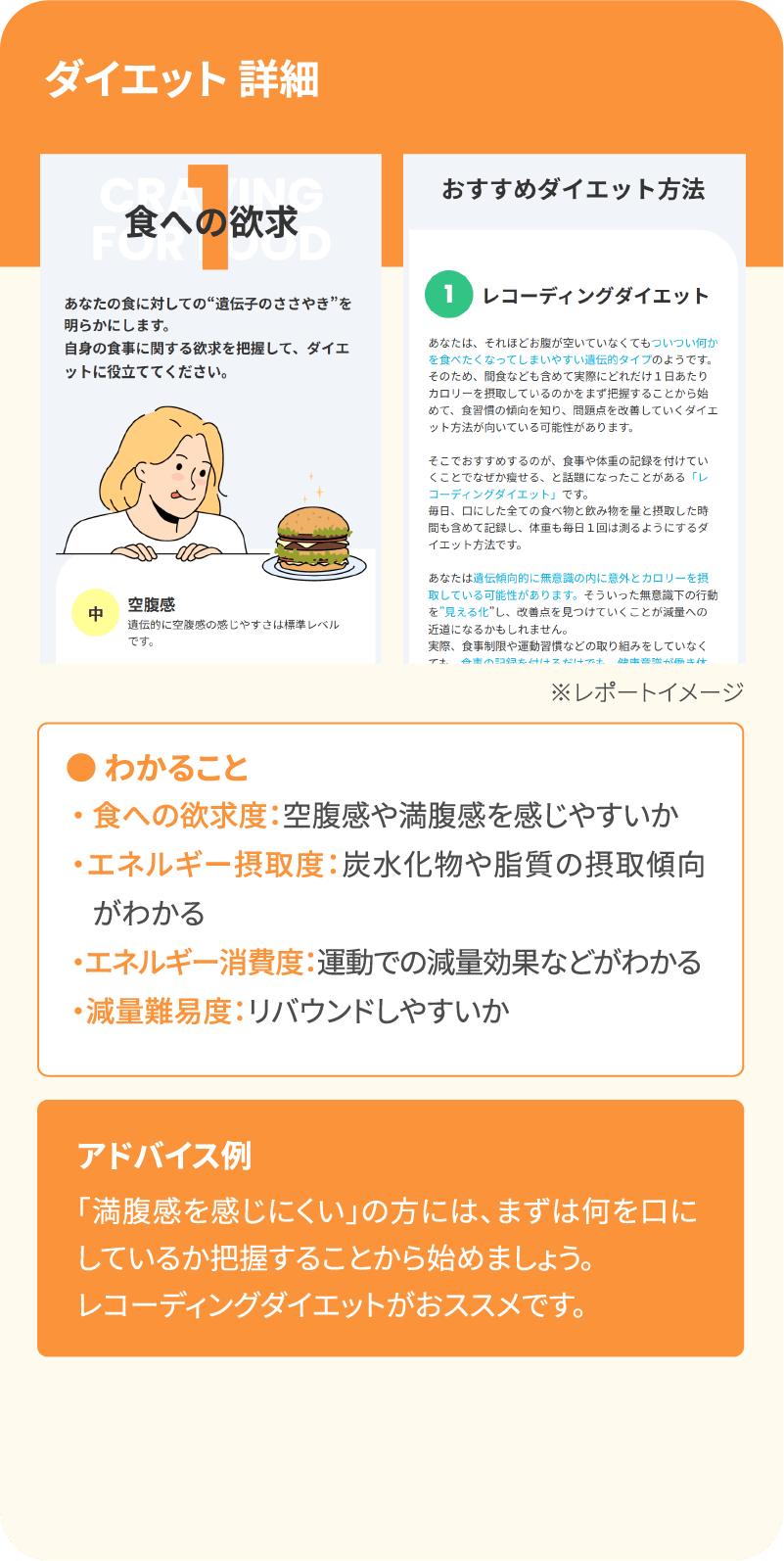 「自分に合ったダイエット方法がわかり、すんなり-2kg!」 結果が細かく出るのにレポートがとても見やすく、何度も見返しています。自分に合ったダイエット方法が見つかり、意識が変わったおかげで、すんなり2キロくらい落ちました!うれしいです。