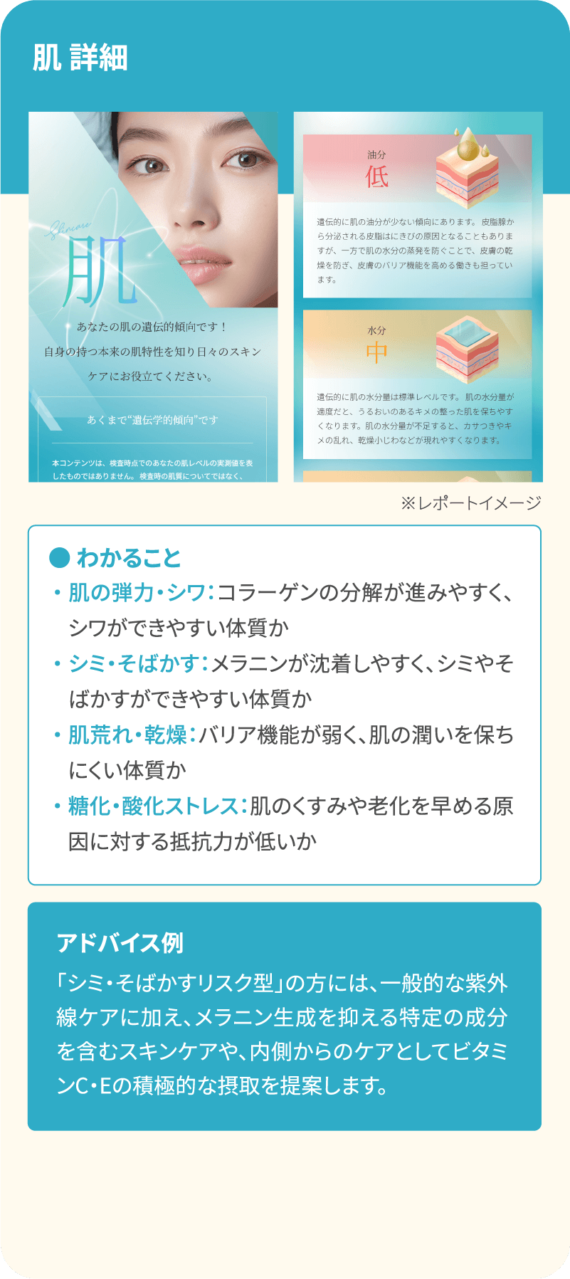 「唾液だけで簡単!肌や体質に合ったケアが実践できました」 唾液採取で簡単に検査できるのが良かったです。不足しやすい栄養素のサプリを取り入れたり、肌に合った化粧品に変えたところ、体と肌の調子が良くなり本当にありがたいです!結果項目が多くて見るのも楽しいです。