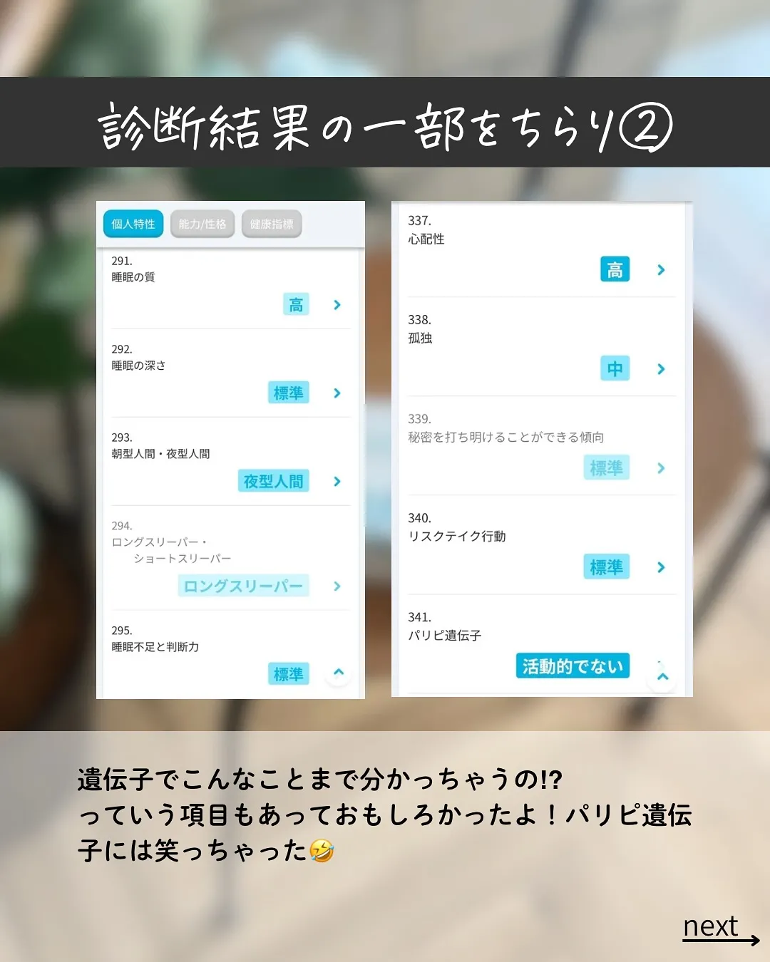 A. chatGENEの400項目(予防165項目+体質235項目)に、新型コロナウィルスの重篤化リスクや前兆のない片頭痛のリスクやアルツハイマー病など、chatGENE Proならではの高精度独自アルゴリズム分析100項目を追加し、合計500項目の遺伝的傾向がわかります。 ※全500項目。男性は492項目、女性は495項目となります。