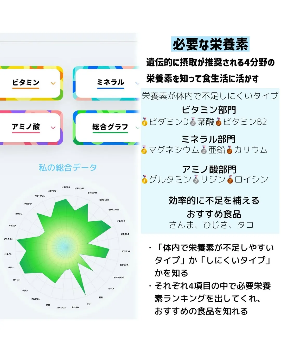 わかるとどうなる?自分たちに効果的なサプリ選び・体の内側から整える食習慣が見つかる