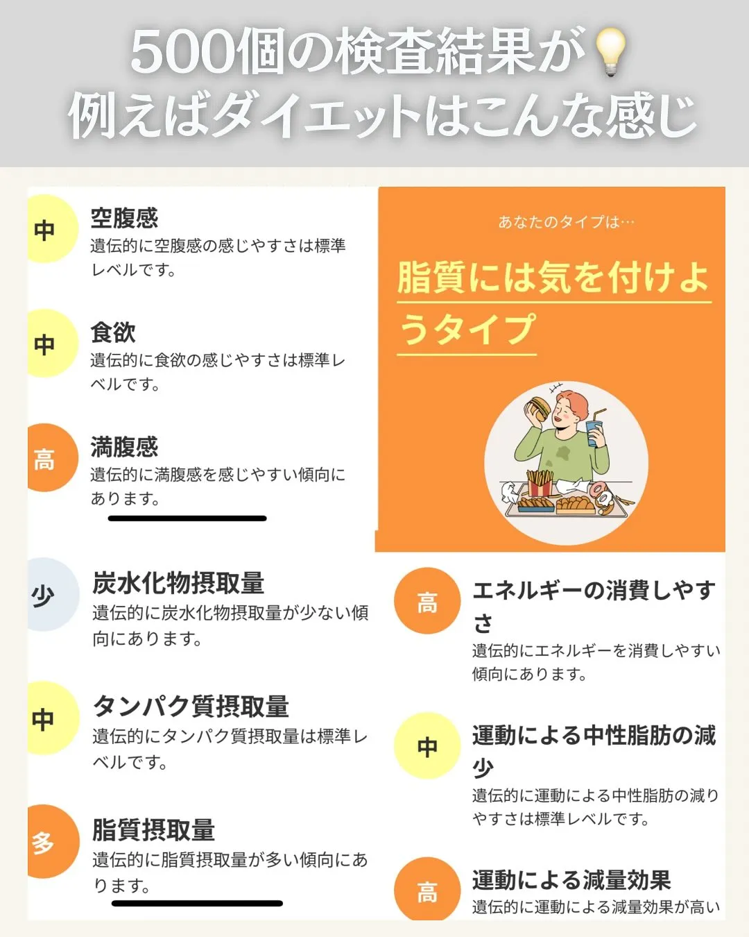 - 業界最多レベルの500検査項目で自分の遺伝的傾向が丸わかり